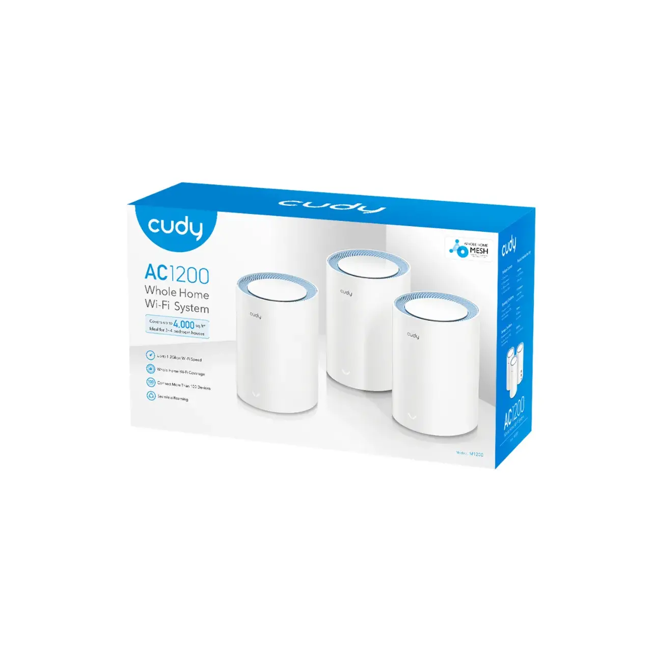 Cudy M1200 3‑pack: cobertura Wi‑Fi Mesh AC1200 dual‑banda, MU‑MIMO, app de control y fácil instalación para hogares grandes.
