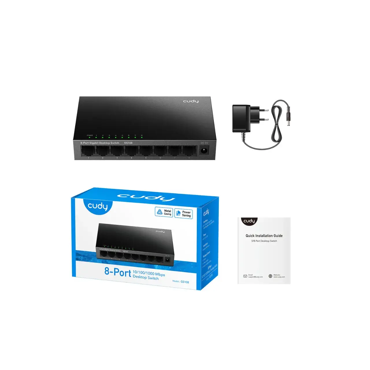 Switch Cudy GS108 con 8 puertos Gigabit, alcance extendido de 170 m, bajo consumo, carcasa metálica y diseño compacto para hogar u oficina.